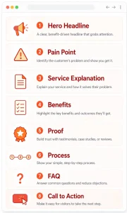 Every high-performing service page should include a clear headline, a specific service explanation, buyer-focused benefits, proof, process details, FAQs, internal links, and a strong call to action.